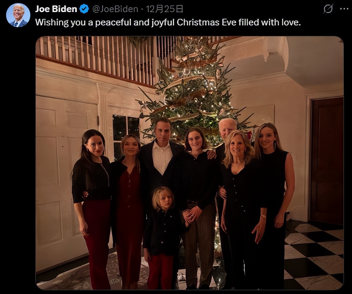 除此以外,亨特·拜登还在平安夜的家庭合照中,精准地占据画面“C位”,把给他争取了未来、此刻本应安享节日的老父亲挤在角落,拜登这位老父亲的半个脑袋还被遮住。