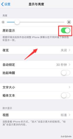 3、进入显示与亮度,查看亮度下方是否有原彩显示这个选项卡