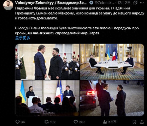 泽连斯基1日在巴黎与马克龙举行会晤 推文截图