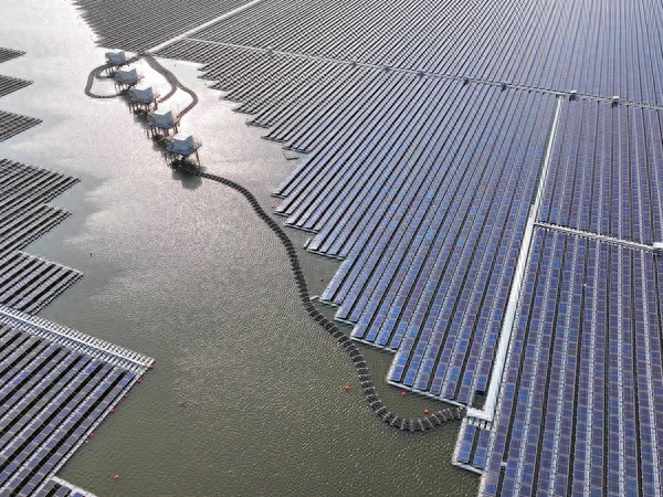 2025年10月28日,青岛。青岛城阳北岸城晖100兆瓦渔光互补项目,融合“水下养殖、水上发电、生态旅游”多种业态,通过立体开发实现多重效益。 IC photo