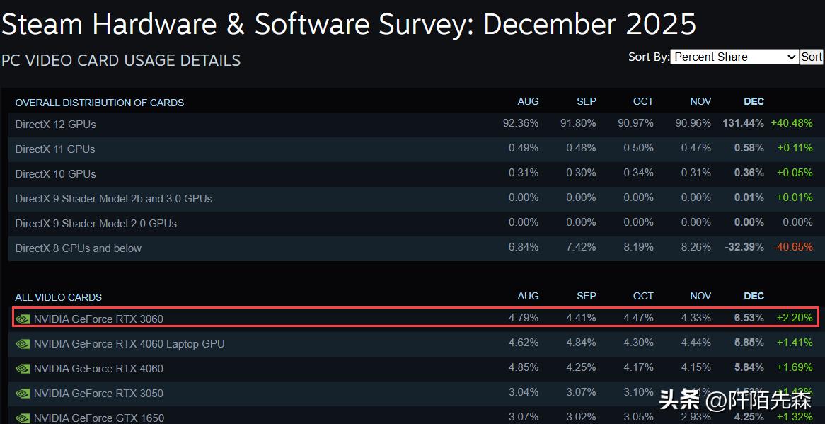 自从网红甜点卡1060之后,3060恐怕是后继者,其占有率一直位居Steam榜首。如果你以为RTX 3060 已经彻底退出显卡市场,不再生产,那现在可能要改口了。