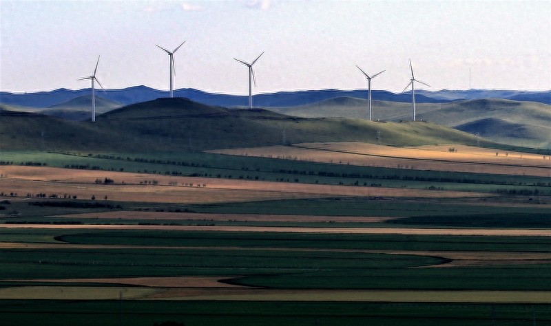 资料图:在内蒙古辽阔美丽的辉腾锡勒草原上,一排排巨大的风力发电机高高挺立。 IC Photo
