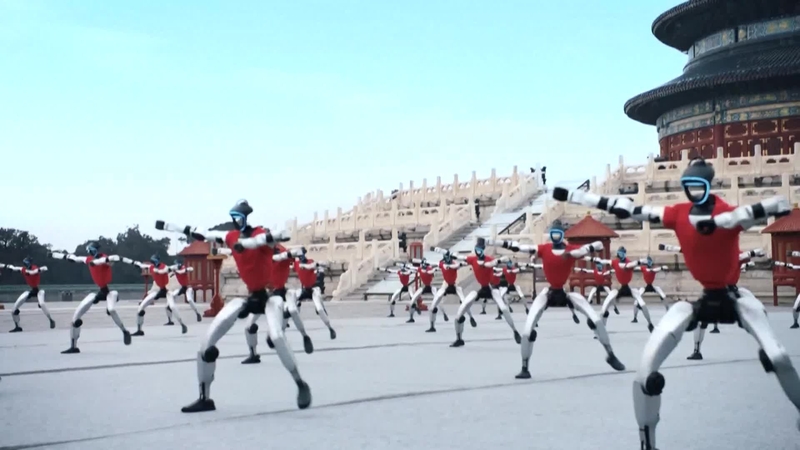 (视频截图)宇树G1机器人集体现身北京天坛,进行武 BOT 天坛祈福集群演示。图片来源:CCTV+ IC Photo