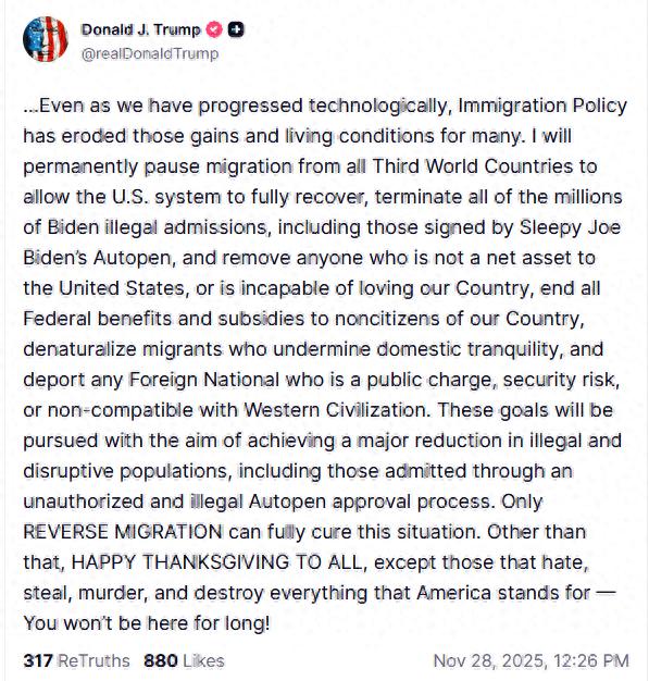 11月28日,特朗普在社交媒体“X”和“真实社交”上发帖,突然宣布将“终止向菲美国公民提供所有联邦福利和补贴”,并“永久暂停来自所有‘第三世界’国家的移民”、“让美国体系完全恢复”。