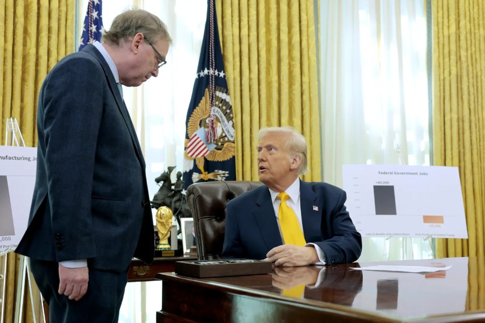 当地时间3月7日,特朗普在白宫椭圆形办公室与哈塞特交谈 美国《新闻周刊》