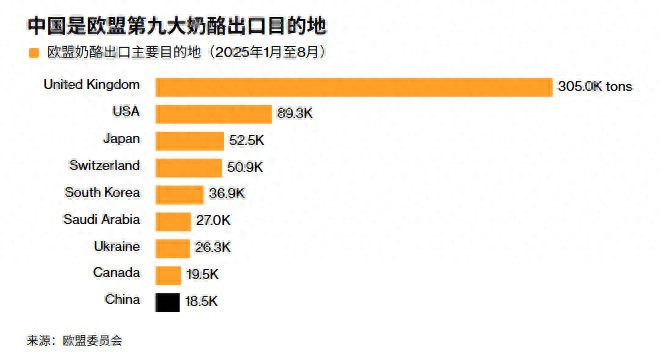 彭博社援引数据称,中国在今年前10个月进口了15.6万吨奶酪,其中14.5%来自欧盟,而新西兰则占进口量的60%以上。根据欧盟委员会的一份报告,今年前八个月,中国是欧盟第九大奶酪出口目的地。
