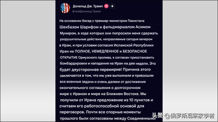 他以一贯的风格宣布,此次军事行动的所有目标均已达成,最终和平协议即将敲定。更重要的是,美国总统表示已收到伊朗提出的10 点和平计划,并认为该方案具备可行性。