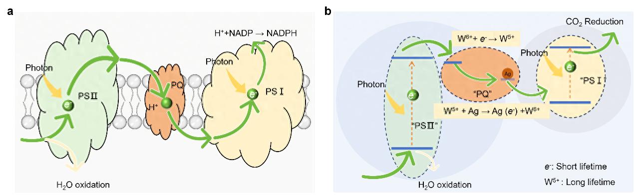 植物通过光合作用,巧妙地将结构简单的二氧化碳和水转化为复杂的养分分子,为人类借助化学手段实现温室气体二氧化碳的资源化利用提供了自然范例。然而,人工模拟光合作用的过程仍面临科学挑战,其关键瓶颈在于:光激发功能材料所产生的电子(用于还原二氧化碳)与空穴(用于氧化水)寿命极短,难以实现二者反应的同步与持续进行。