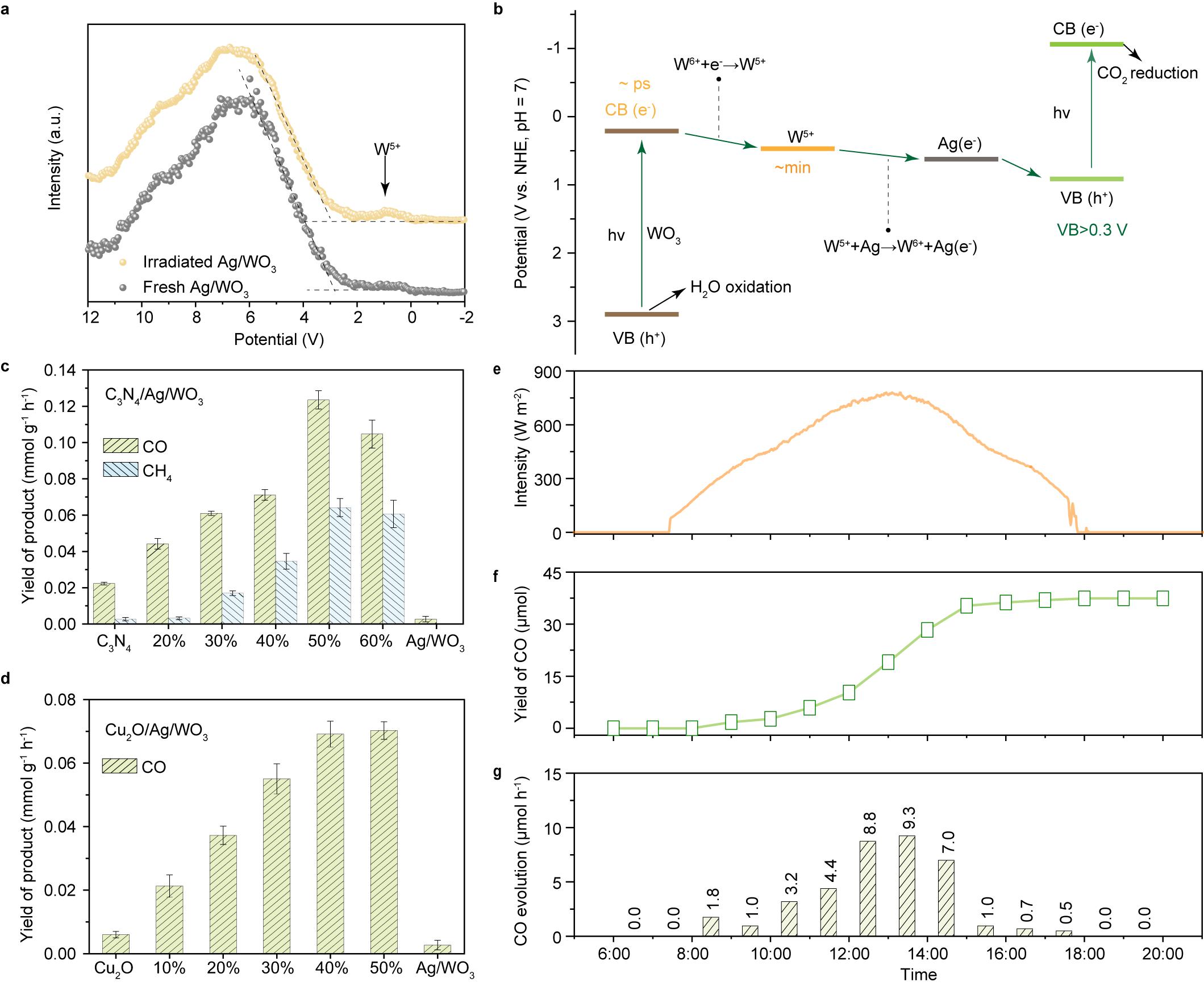 我国科研团队这项新方案模拟植物暂存光生电子的生理机制,创新性地设计出一种电子存储路径,通过定向设计、制备材料结构,使其能够在光照时储存电子,并在需要时精准释放,从而实现对二氧化碳与水反应速率和程度的精确调控。基于这一思路,研究团队成功构建出具有电子存储功能的银修饰三氧化钨(Ag/WO3)材料。通过将其与催化活性组分酞菁钴复合进行验证,测得二氧化碳转化效率较纯酞菁钴提升了近百倍。此外,这一策略具备良好的通用性与适用性,可根据实际需求构建多种结构适配的复合催化剂体系。该方案在自然光条件下运行稳定,为利用太阳能规模化转化二氧化碳、生产一氧化碳、甲烷等清洁能源提供了可行的技术路径。